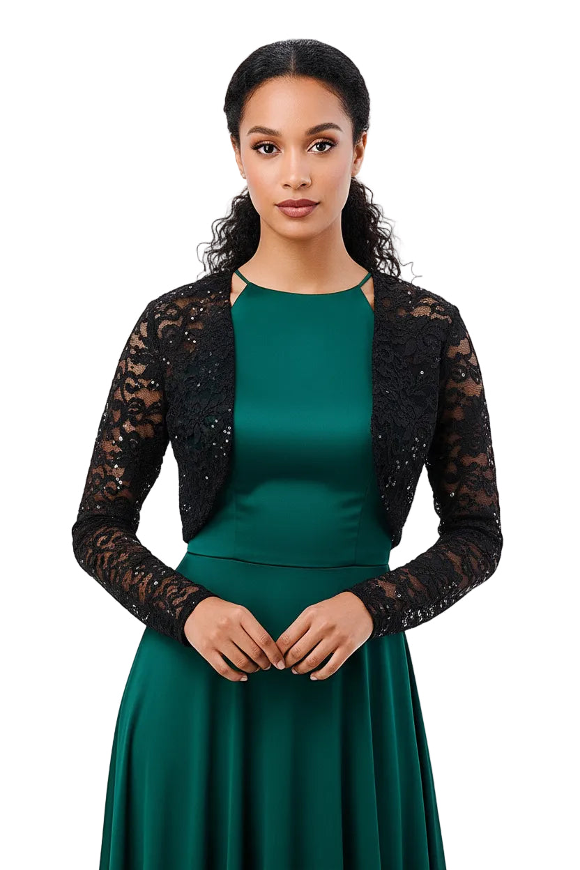 Wrap yourself in luxury with the Lux Bolero. This cropped jacket features delicate lace with sequins and a draped neckline, perfect for elevating any look. With long sleeves and an open front, it's the perfect addition to your wardrobe for any occasion. (You'll feel like a queen in this bolero, trust us.)