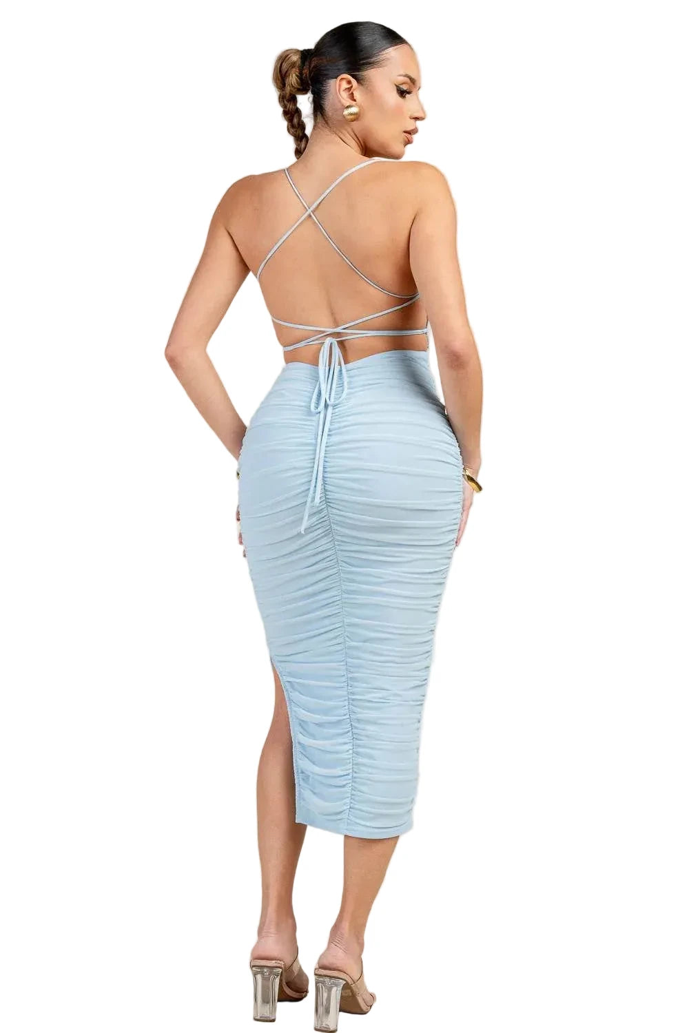 This Colmar Midi dress has it all! From the lux mesh drawstring to the back lace up and ruched maxi design, you'll be flaunting your best features and turning heads without skipping a beat! After all, who said comfort can't be stylish? (Wink!)