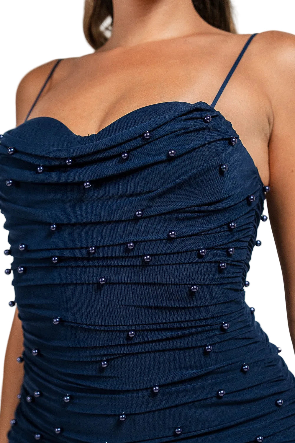 "Show off your fun side with the Lux Pearl Mini! This bodycon mini dress features a trendy pearl mesh ruched sleeveless design, perfect for a night out. The dress is made with a comfortable blend of nylon and spandex, and includes a polyester lining for a flattering fit. Imported and available in multiple sizes. Model is 5'8" and wearing a small. Don't miss out on this playful piece!"