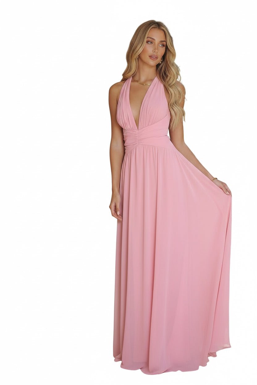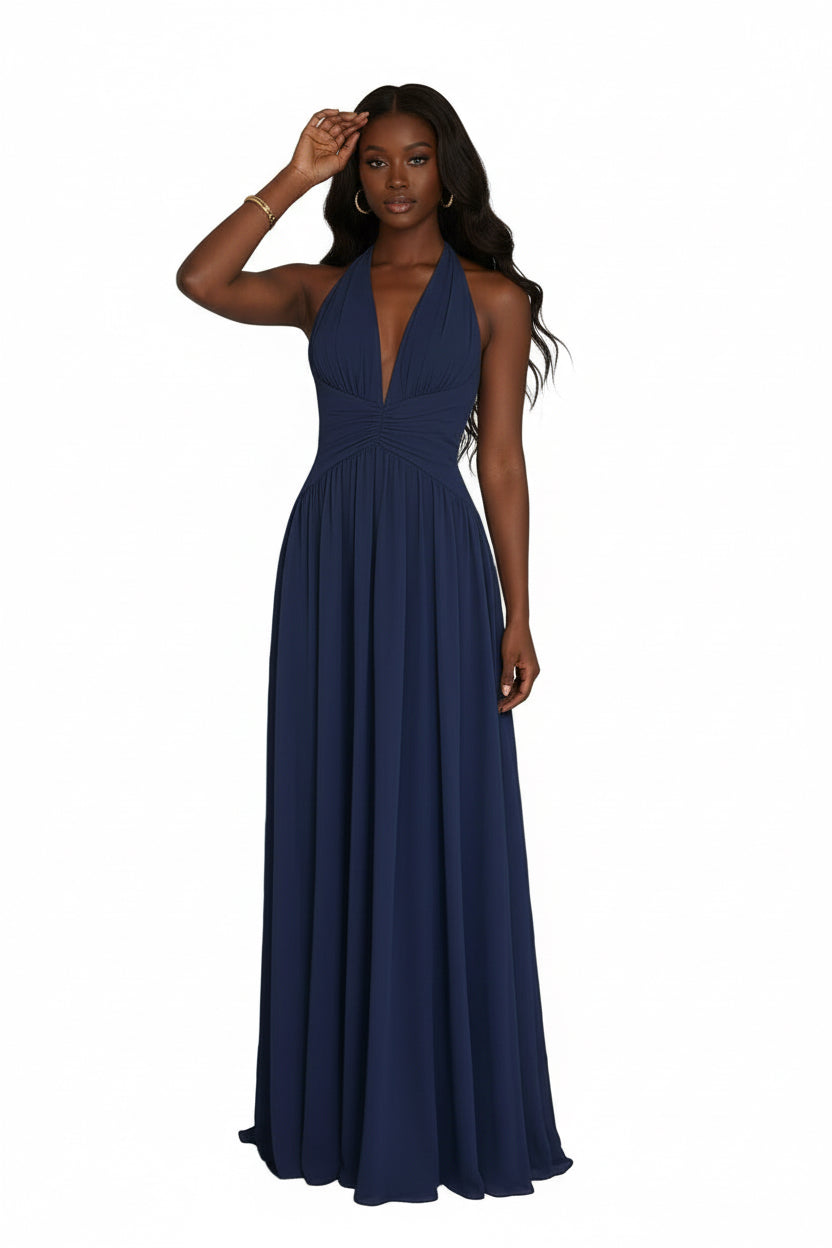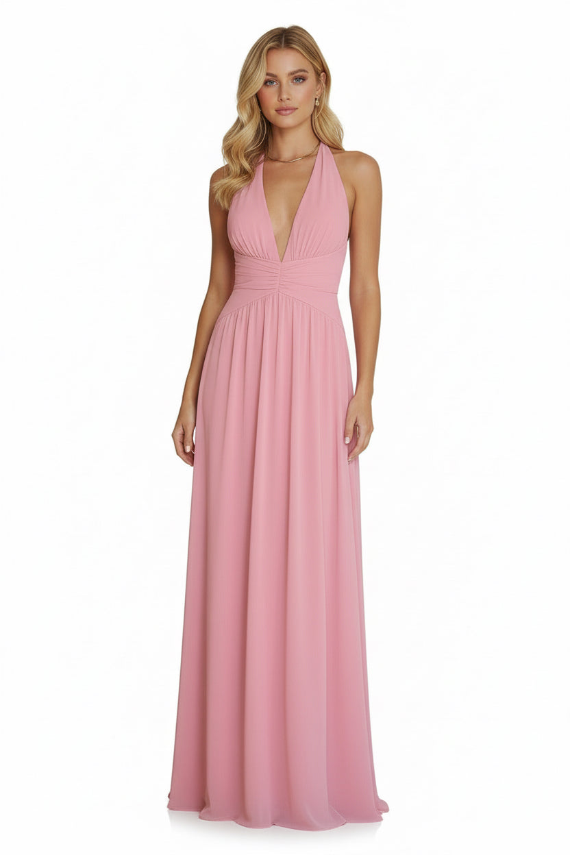 Make a stunning impression in the Ginevra Maxi. Crafted with lightweight chiffon, this gown features a flattering halter neckline, ruched bodice, and full A-line skirt. The back neck tie and plunging detail add a touch of modern allure, perfect for prom, weddings, or any special occasion.