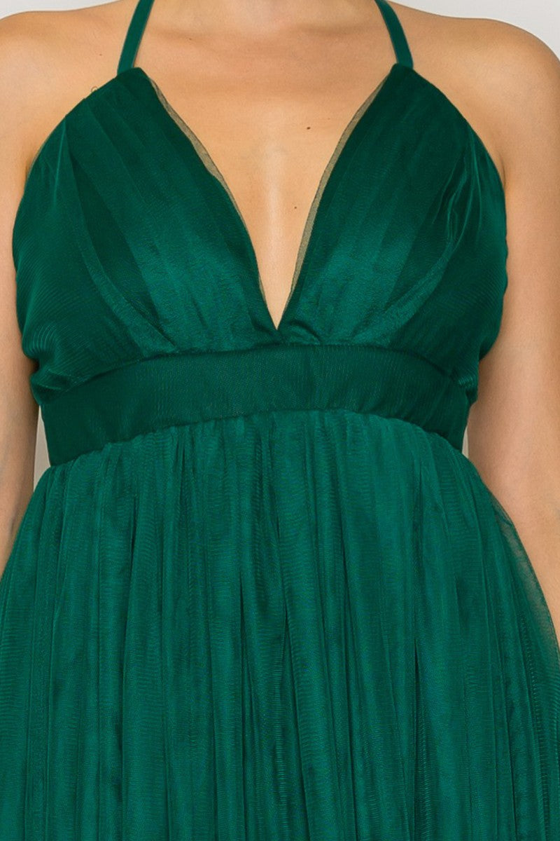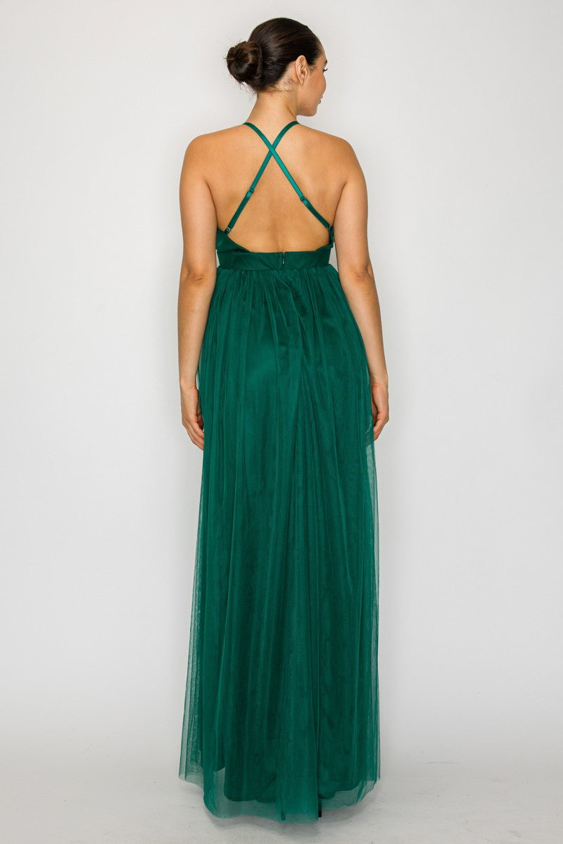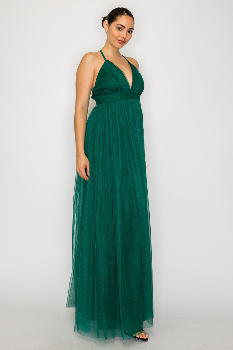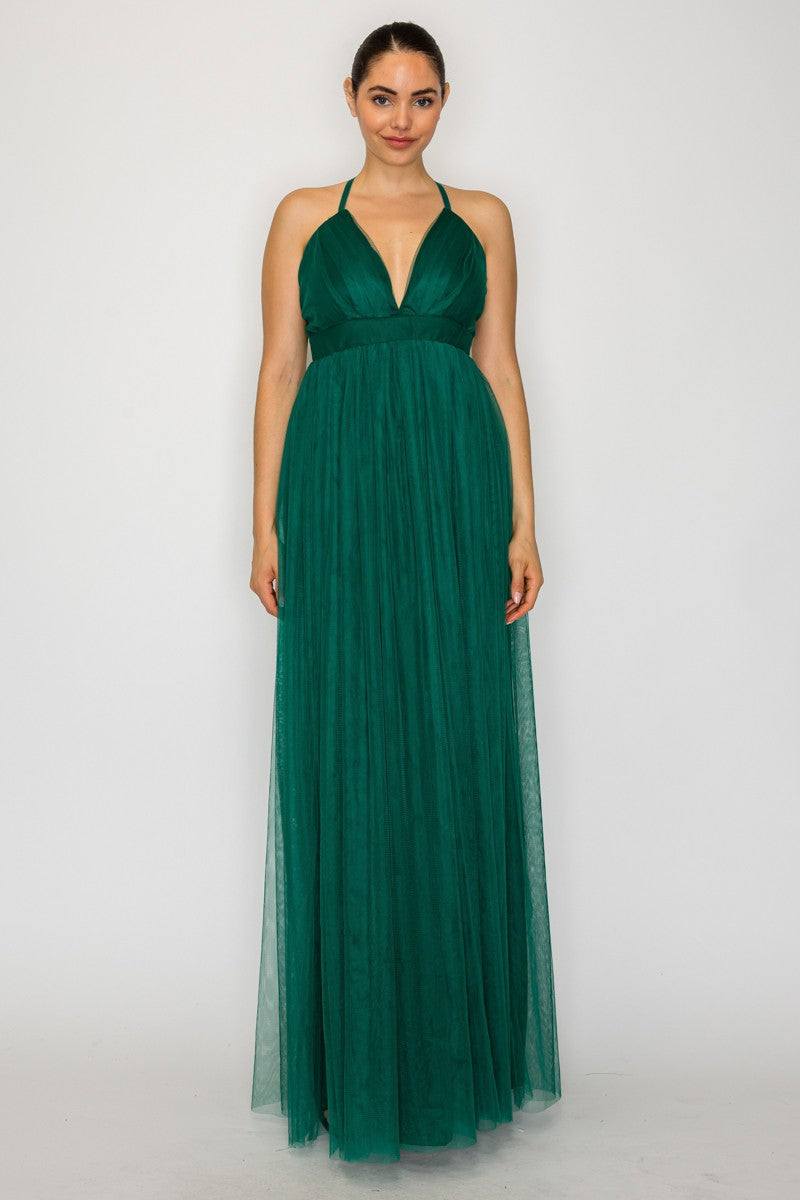 The Kalena Maxi is your go-to dress for effortless elegance. This stunning tulle gown features a daring plunging V-neckline and daringly low-cut back with adjustable crossed straps for a customizable fit. A cinched waist defines your silhouette while the voluminous layered skirt adds movement and drama. Hidden back zipper closure ensures a seamless finish. Perfect for special occasions, this versatile piece transitions beautifully from evening events to statement-making moments.