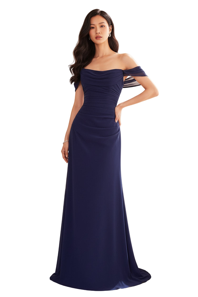 Slip into pure magic with the Persephone Maxi—a show-stopping off-the-shoulder chiffon gown that'll have everyone asking who designed your look. This mermaid beauty hugs your curves in all the right places before flowing into a dreamy skirt that moves like you're walking on air. The delicate chiffon bodice and lace-up back add just the right touch of intrigue, while the off-shoulder neckline frames your collarbones beautifully. Whether you're dancing at prom, standing beside the bride, or commanding attention at a gala, this gown delivers elegance with a playful wink. Timeless, sensual, and utterly unforgettable.
