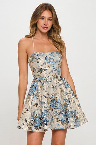 Introducing The Santa Ana - a metallic floral lace-up mini skater dress perfect for any occasion. This dress features a stunning metallic finish and a unique lace-up design, making it a must-have for any fashion-forward wardrobe. With its flattering fit and playful style, you'll be sure to turn heads wherever you go!